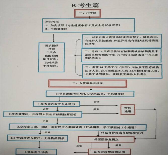 2.來自重點疫情地區(qū)或有旅居史、境外返回、境外人員接觸史、體溫異?;蛴幸伤瓢Y狀等情況,考前14天曾被隔離或曾被隔離未做過核酸檢測、共同居住家庭成員有上述情況的考生,考前14天的工作(實習(xí))崗位屬于醫(yī)療機構(gòu)醫(yī)務(wù)人員、公共場所服務(wù)人員、口岸檢疫排查人員、公共交通駕駛員或鐵路航空乘務(wù)人員的考生,上述考生須提供考前7天內(nèi)核酸檢測陰性證明后方可進入學(xué)校,無提供核酸證明者不得進入校園!