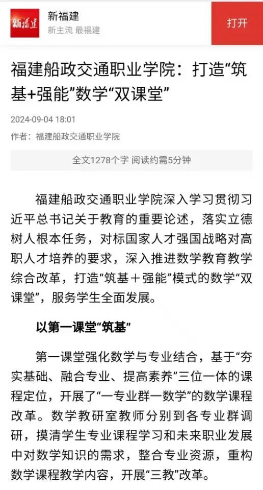 福建船政交通職業(yè)學(xué)院深入學(xué)習(xí)貫徹習(xí)近平總書(shū)記關(guān)于教育的重要論述,落實(shí)立德樹(shù)人根本任務(wù),對(duì)標(biāo)國(guó)家人才強(qiáng)國(guó)戰(zhàn)略對(duì)高職人才培養(yǎng)的要求,深入推進(jìn)數(shù)學(xué)教育教學(xué)綜合改革,打造“筑基+強(qiáng)能”模式的數(shù)學(xué)“雙課堂”,服務(wù)學(xué)生全面發(fā)展。