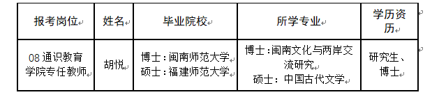 按照《關(guān)于印發(fā)<福建省省屬事業(yè)單位公開招聘工作人員考試暫行辦法>的通知》(閩人發(fā)〔2006〕11號)和《2024年福建船政交通職業(yè)學(xué)院專項公開招聘總量控制高層次人才方案(二)》等文件要求,經(jīng)報名、資格審查、面試、考察、體檢等有關(guān)程序,經(jīng)學(xué)校黨委會議研究,確定胡悅為08通識教育學(xué)院專任教師擬聘用人員,現(xiàn)予以公示。
