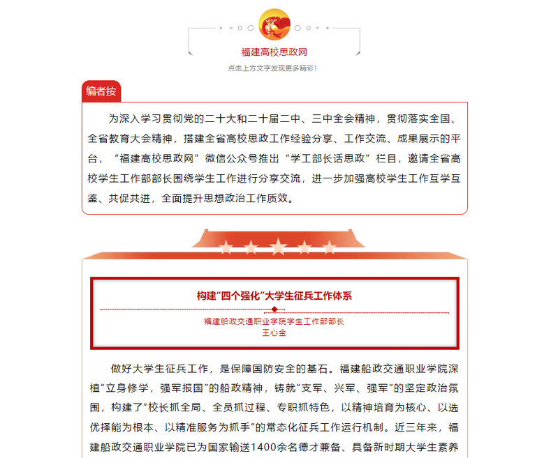 為深入學(xué)習(xí)貫徹黨的二十大和二十屆二中、三中全會(huì)精神,貫徹落實(shí)全國、全省教育大會(huì)精神,搭建全省高校思政工作經(jīng)驗(yàn)分享、工作交流、成果展示的平臺(tái),“福建高校思政網(wǎng)”微信公眾號(hào)推出“學(xué)工部長話思政”欄目,邀請(qǐng)全省高校學(xué)生工作部部長圍繞學(xué)生工作進(jìn)行分享交流,進(jìn)一步加強(qiáng)高校學(xué)生工作互學(xué)互鑒、共促共進(jìn),全面提升思想政治工作質(zhì)效。