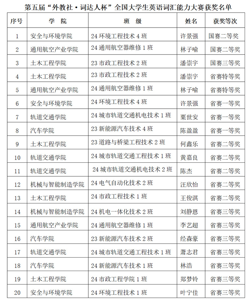 我院共有622名學(xué)生報(bào)名參賽,其中63名學(xué)生晉級(jí)省賽,17名學(xué)生在省賽中獲獎(jiǎng)。經(jīng)過(guò)激烈角逐,我院5名學(xué)生晉級(jí)國(guó)賽,其中,24環(huán)境工程技術(shù)4班許景強(qiáng)、24通用航空器維修1班林子喻榮獲國(guó)賽二等獎(jiǎng),23市政工程技術(shù)2班潘崇宇榮獲國(guó)賽三等獎(jiǎng)。