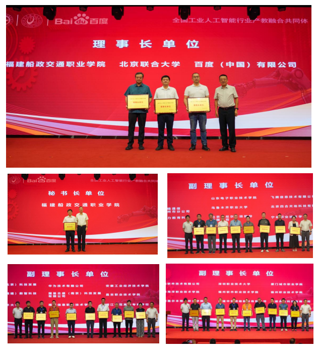 大會現(xiàn)場舉行了理事長單位、副理事長單位、常務理事單位及理事單位授牌儀式,百度(中國)有限公司、北京聯(lián)合大學、福建船政交通職業(yè)學院榮膺理事長單位,福建船政交通職業(yè)學院當選秘書長單位,并順利通過了《全國工業(yè)人工智能行業(yè)產(chǎn)教融合共同體章程》。