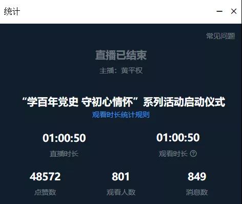本次“學(xué)百年黨史,守初心情懷”啟動(dòng)儀式共計(jì)801人參與,互動(dòng)次數(shù)達(dá)849次,點(diǎn)贊數(shù)達(dá)48572次,同學(xué)們積極參與,反響熱烈,取得了圓滿成功!