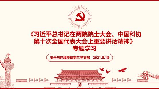 2021年8月18日,安全與環(huán)境學院第三黨支部組織專題學習了習近平總書記在兩院院士大會、中國科協(xié)第十次全國代表大會上重要講話精神。與會黨員教師結合自身實際工作,暢談了學習習近平總書記重要講話精神的體會和感受。大家一致認為習近平總書記的講話體現(xiàn)了國家對科技創(chuàng)新工作的關心和重視,是新發(fā)展階段全體科技工作者的根本遵循和行動指南。