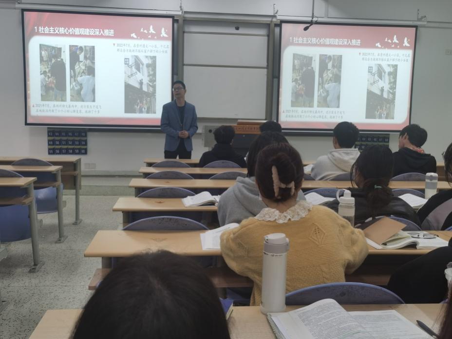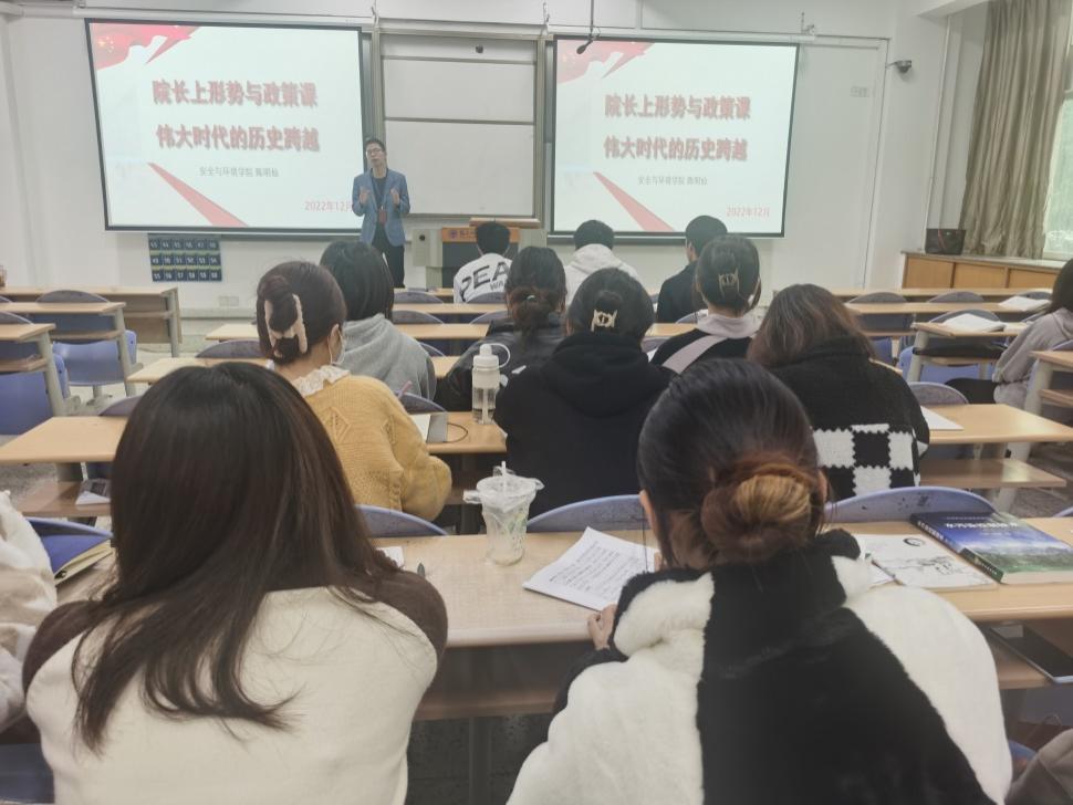 為更好貫徹落實中辦、國辦《關(guān)于深化新時代學(xué)校思想政治理論課改革創(chuàng)新的若干意見》,中組部、中宣部、教育部《關(guān)于領(lǐng)導(dǎo)干部上講臺開展思想政治教育的意見》及省委教育工作領(lǐng)導(dǎo)小組《關(guān)于深化新時代學(xué)校思想政治理論課改革創(chuàng)新行動方案》,安全與環(huán)境學(xué)院院長陳明仙參與思政教研室的集體備課,于2022年12月8日,給安全與環(huán)境學(xué)院學(xué)生講授思政課、講授以“偉大時代的歷史跨越”為主題的形勢與政策課。