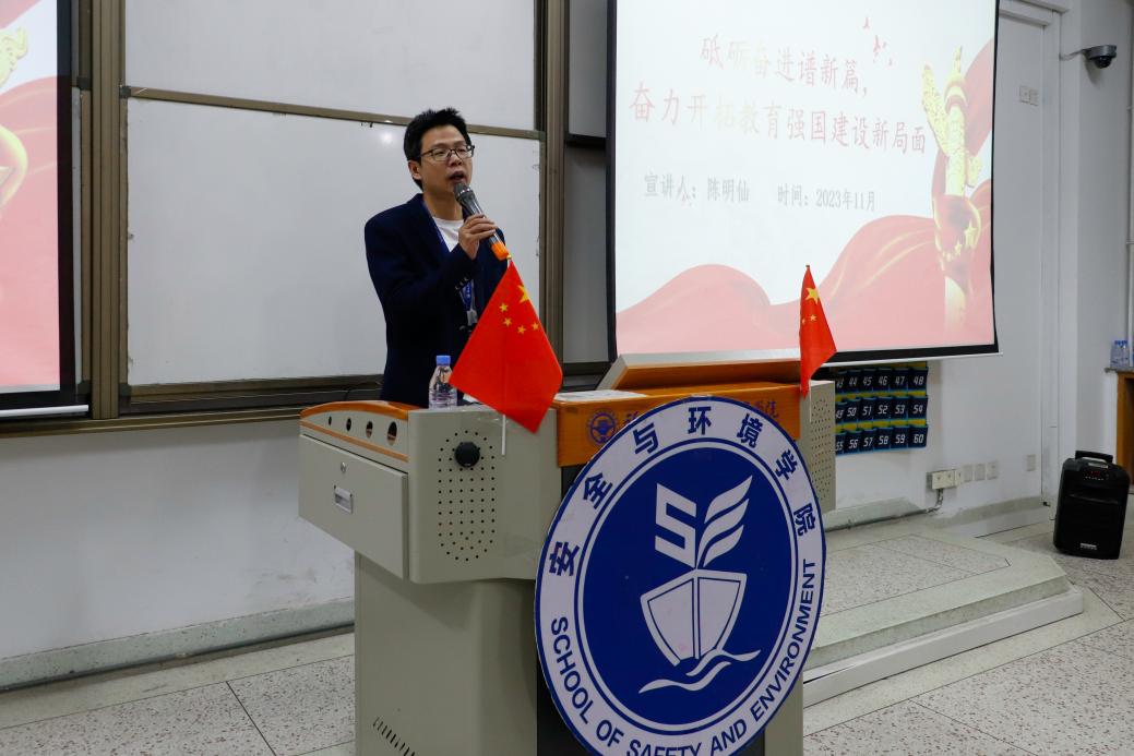 為推動(dòng)學(xué)習(xí)貫徹習(xí)近平新時(shí)代中國(guó)特色社會(huì)主義思想主題教育走深走實(shí)、見(jiàn)行見(jiàn)效,深入學(xué)習(xí)習(xí)近平總書(shū)記關(guān)于教育的重要論述,帶領(lǐng)同學(xué)們?nèi)嫔钊肓私饨逃龔?qiáng)國(guó)的內(nèi)涵,2023年11月20日晚,安全與環(huán)境學(xué)院院長(zhǎng)陳明仙在創(chuàng)新樓201教室為我院發(fā)展對(duì)象與入黨積極分子講授專題黨課。