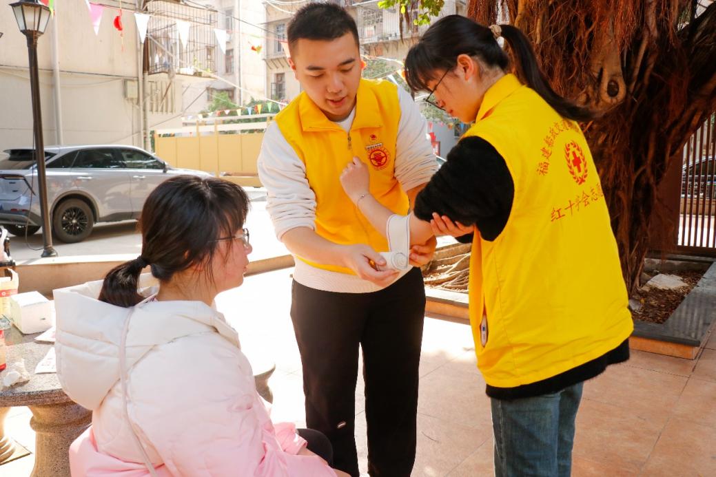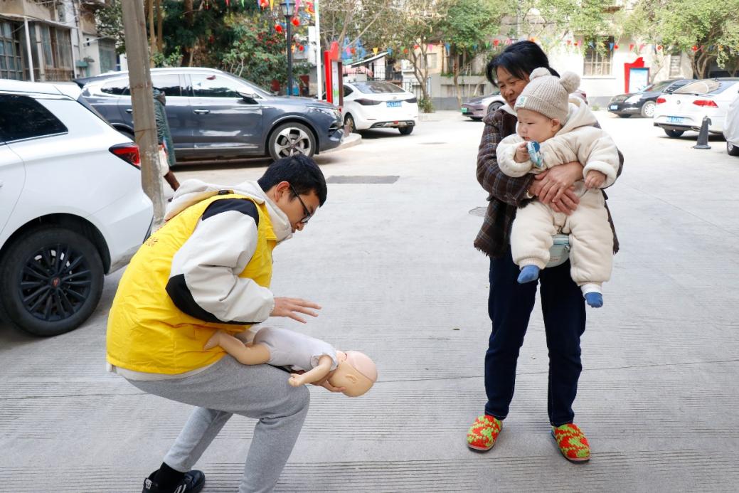 志愿者先向居民講解有關(guān)心肺復(fù)蘇救護、海姆立克急救法和包扎的基本常識與應(yīng)用環(huán)境,隨后居民在志愿者們的協(xié)助下進(jìn)行實操,如在仿真人體上演練心肺復(fù)蘇和海姆立克急救法,真人練習(xí)三角巾包扎,讓居民們對于急救知識有了深入的了解。
