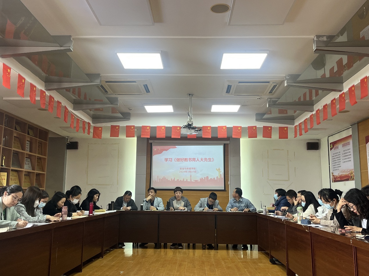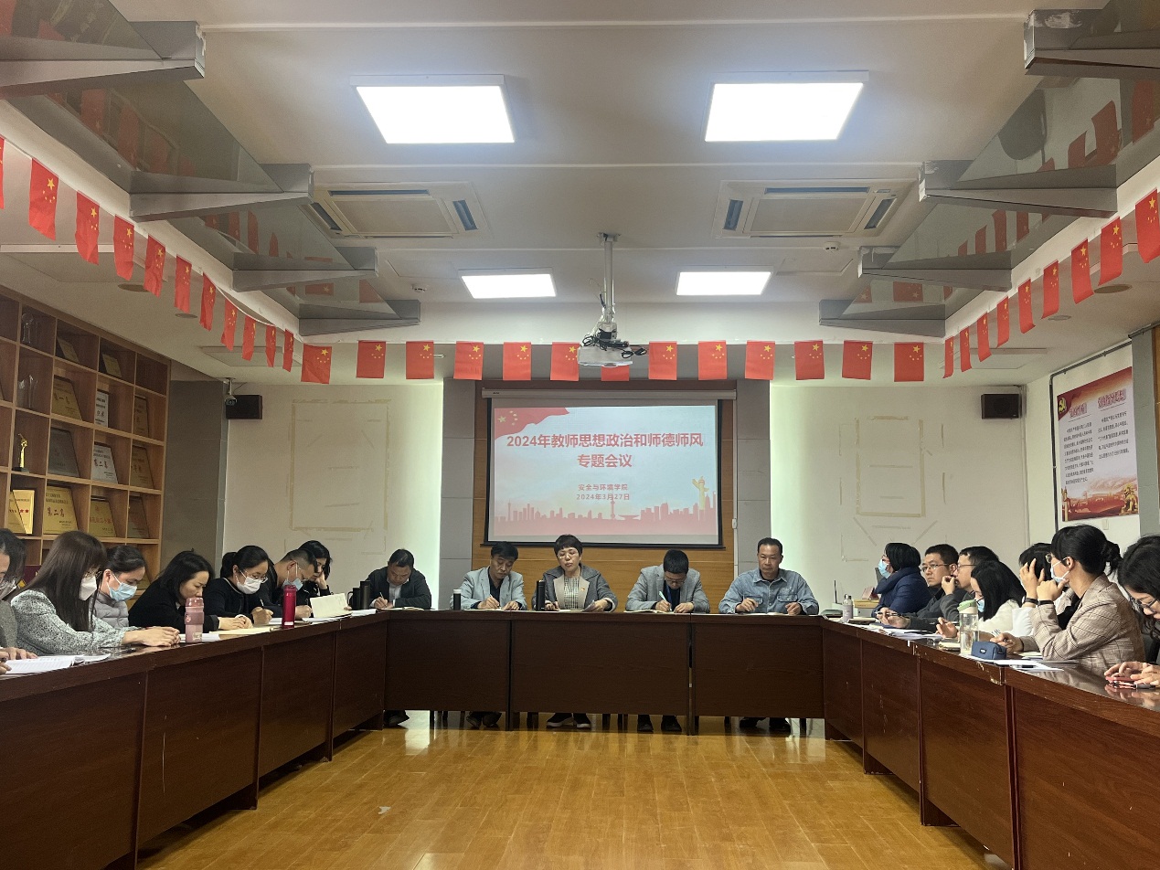 為鞏固拓展學(xué)習(xí)貫徹習(xí)近平新時(shí)代中國特色社會(huì)主義思想主題教育成果,認(rèn)真學(xué)習(xí)貫徹習(xí)近平總書記關(guān)于教育的重要論述和指示批示精神,進(jìn)一步加強(qiáng)教師思想政治教育和師德師風(fēng)建設(shè)工作,落實(shí)立德樹人根本任務(wù),引導(dǎo)教師堅(jiān)守教育初心,踐行育人使命,規(guī)范從教行為,2024年3月27日下午,安全與環(huán)境學(xué)院在創(chuàng)新樓909會(huì)議室召開2024年教師思想政治和師德師風(fēng)專題會(huì)議,學(xué)院全體教職工參加。