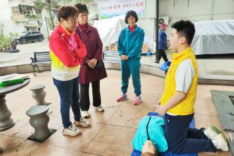 在急救救護科普活動現(xiàn)場,志愿者們向居民講解心肺復蘇救護和包扎的基本知識以及應用環(huán)境,隨后居民們在志愿者們的協(xié)助下進行實操。通過在仿真人體模型上演示心肺復蘇救護,真人練習繃帶包扎,讓居民們對急救知識有了更深刻的認識與了解。
