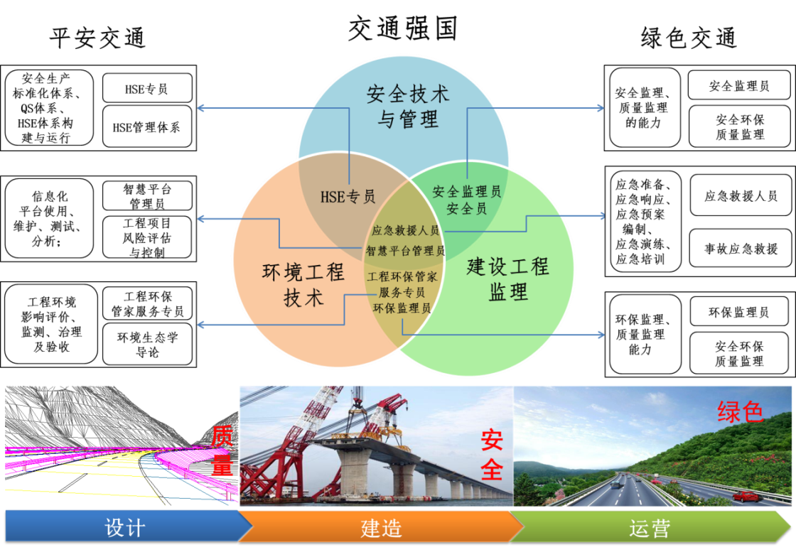專(zhuān)業(yè)群圍繞一個(gè)鏈條,聚焦工程安全、環(huán)境、質(zhì)量三大關(guān)鍵要素,培養(yǎng)覆蓋交通工程項(xiàng)目安全環(huán)境評(píng)價(jià)論證、安全環(huán)保設(shè)施設(shè)計(jì)及審查、安全及綠色建造、智慧建管、安全環(huán)保質(zhì)量一體化監(jiān)理、安全綠色運(yùn)營(yíng)、工程全壽命周期健康監(jiān)測(cè)等多層次交叉復(fù)合型人才,為交通工程行業(yè)領(lǐng)域提供有力的人才支持。