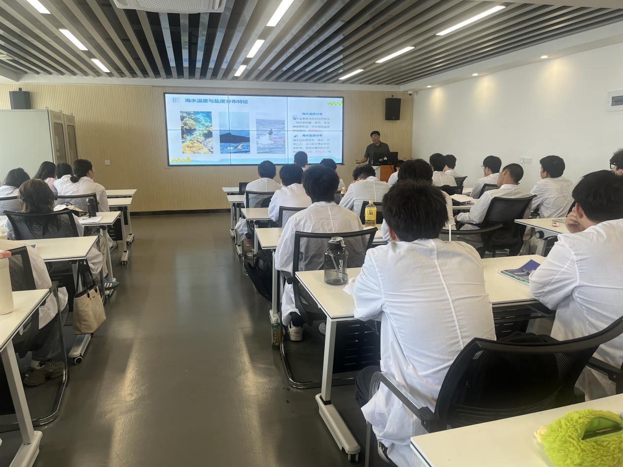 王培剛教授從海洋水文環(huán)境、海洋生物資源、海洋礦產(chǎn)資源、海洋能源、海洋資源展開,結(jié)合全球海洋酸化、赤潮頻發(fā)等熱點問題,系統(tǒng)闡釋了海洋環(huán)境與陸地生態(tài)系統(tǒng)的聯(lián)動關(guān)系,強調(diào)“海洋健康是地球可持續(xù)發(fā)展的生命線,環(huán)境工程技術(shù)專業(yè)人才是守護這條生命線的核心力量”。王教授還就海洋深遠海調(diào)查裝備展開,向?qū)W生介紹了我國深遠海調(diào)查現(xiàn)狀及展望。