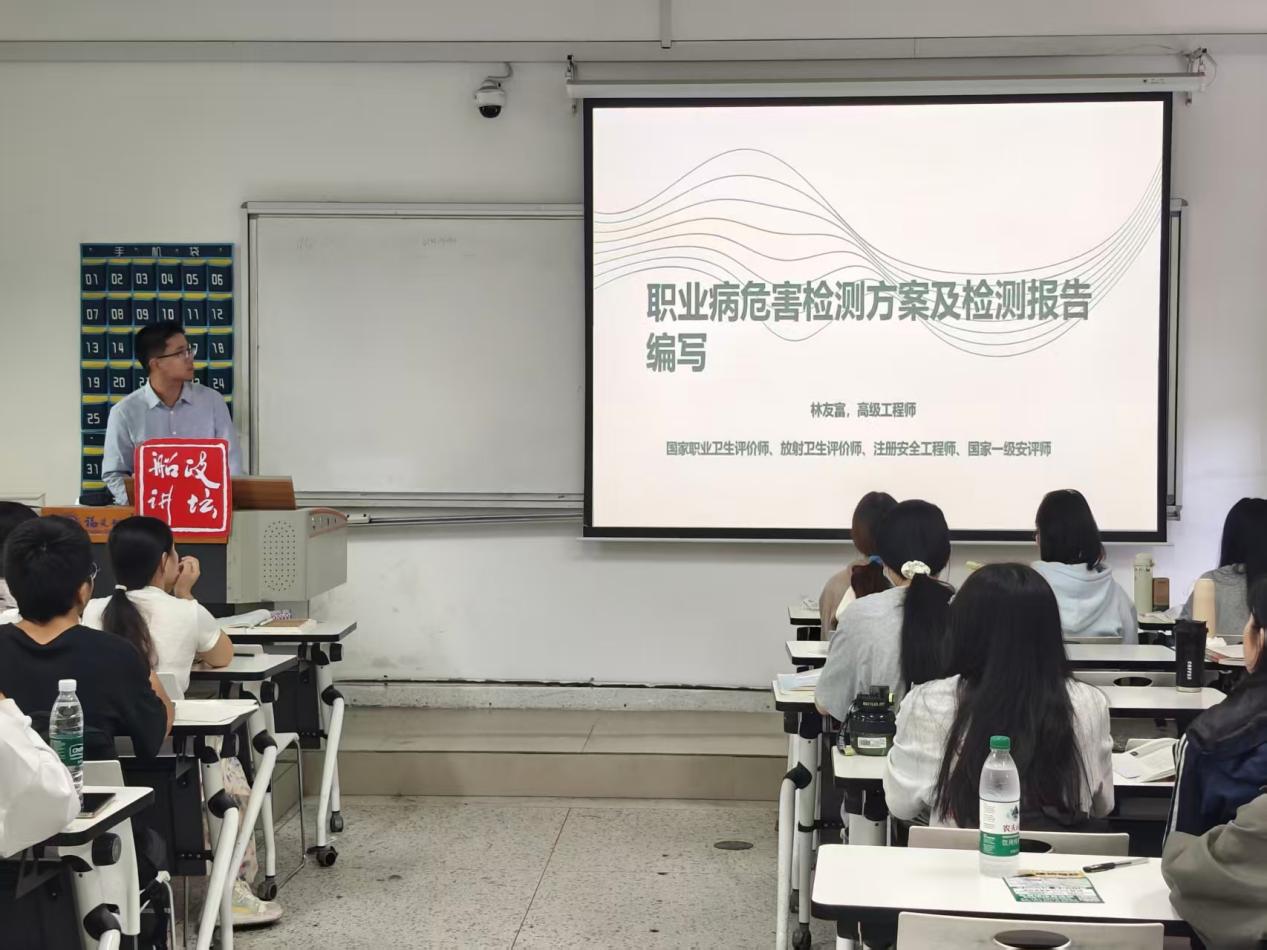 林友富高工是職業(yè)健康安全領(lǐng)域的資深專家,擁有高級工程師、國家職業(yè)衛(wèi)生評價(jià)師、放射衛(wèi)生評價(jià)師、注冊安全工程師、國家一級安評師等多項(xiàng)專業(yè)資格,長期致力于職業(yè)病危害檢測與評價(jià)工作,在職業(yè)健康安全管理方面積累了豐富經(jīng)驗(yàn)。講座中,林友富以熱電廠為例,結(jié)合自身職業(yè)健康安全實(shí)踐,系統(tǒng)闡述了職業(yè)病危害因素的工程分析方法、職業(yè)病危害檢測方案的制定要點(diǎn)以及檢測報(bào)告的編寫流程,并分享了實(shí)際操作中的注意事項(xiàng)和典型案例。通過講座,學(xué)生深入了解了職業(yè)病危害檢測的專業(yè)技能和行業(yè)標(biāo)準(zhǔn),增強(qiáng)了對該領(lǐng)域的興趣與認(rèn)知。林友富高工還為學(xué)生提供了職業(yè)發(fā)展規(guī)劃建議,鼓勵有志學(xué)生投身職業(yè)健康安全事業(yè),為行業(yè)高質(zhì)量發(fā)展貢獻(xiàn)力量。