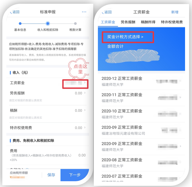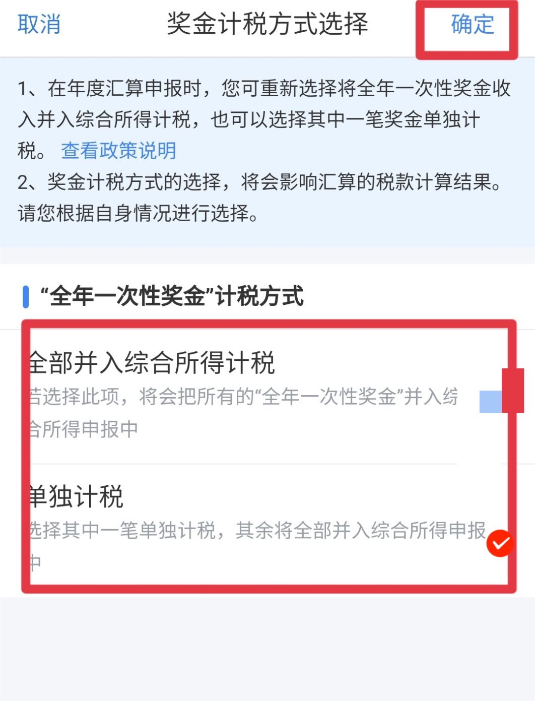 特別注意“年終一次性獎金”計稅方式的選擇,因為不同計稅方式會導致稅額不同,您在正式提交申報前可比較選擇最優(yōu)計稅方式。具體方法為:點擊“工資薪金”進入【獎金計稅方式選擇】,可選擇將獎金【全部并入綜合所得計稅】,或選擇【單獨計稅】,點擊【確定】然后返回申報界面查看不同計稅結果。