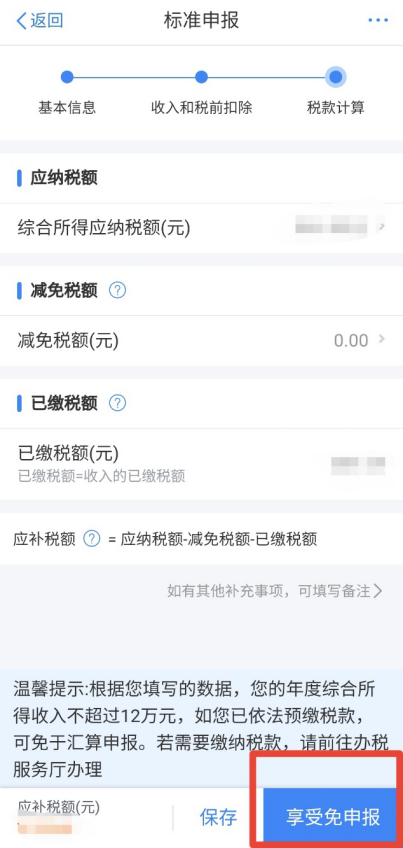 若您收入不足12萬元且有應補稅額,或收入超出12萬元但應補稅額≤400元,申報提交后無需繳款,點擊【享受免申報】。