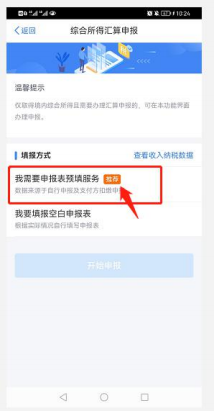 從首頁中間部位【2020綜合所得年度匯算】-【開始申報入】; 進入申報界面,選擇【我需要申報表預填服務】后,點擊【開始申報】,在標準申報須知界面,點擊【我已閱讀并知曉】。