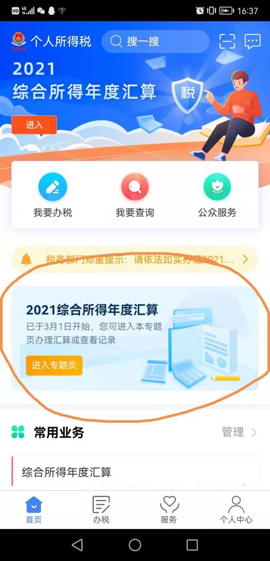 登錄“個人所得稅”APP,從首頁中間部位點擊【綜合所得年度匯算】
