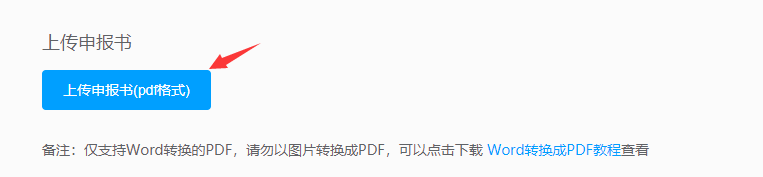 傳項(xiàng)目后,需要上傳項(xiàng)目申報(bào)書,點(diǎn)擊“上傳申報(bào)書(加蓋公章的pdf掃描件)”,(備注:僅支持Word轉(zhuǎn)換的PDF,請勿以圖片轉(zhuǎn)換成PDF,可以點(diǎn)擊下載 Word轉(zhuǎn)換成PDF教程查看),上傳項(xiàng)目申報(bào)書。