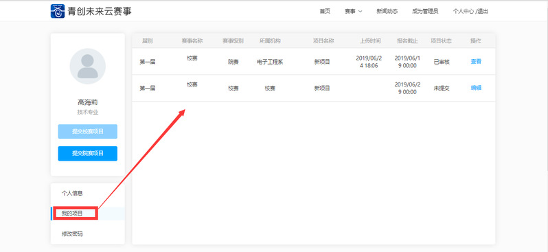 完成項(xiàng)目申報(bào)書上傳,完成項(xiàng)目創(chuàng)建,“提交”成功后,在“個(gè)人資料”——“我的項(xiàng)目”中可查看已上傳項(xiàng)目具體信息(屆別、賽事名稱、賽事級別、所屬機(jī)構(gòu)、項(xiàng)目名稱、上傳時(shí)間、報(bào)名截止時(shí)間以及項(xiàng)目狀態(tài))。