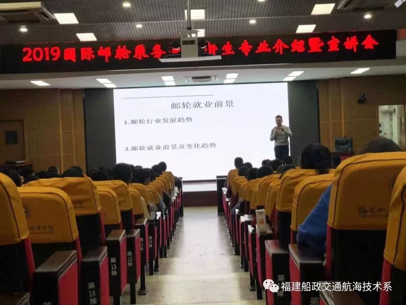 為使我系19級國際郵輪乘務(wù)新生能夠更快適應(yīng)大學(xué)生活,了解自己所學(xué)專業(yè),明確學(xué)習(xí)目標(biāo),增強(qiáng)學(xué)習(xí)動力。航海技術(shù)系于2019年9月9日19點在一號樓學(xué)術(shù)報告廳開展了“2019級國際郵輪乘務(wù)管理新生專業(yè)介紹暨宣講講座”。并邀請廈門海陸海事服務(wù)有限公司郵輪面試官李樂天先生、航海技術(shù)系副主任翁國玲老師和黃超夷老師參加本次宣講。