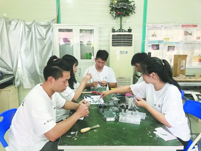 天氣炎熱,工作室四臺風扇呼呼地吹,但這并沒有影響學生們的專注。這個長約2米的船模,已經(jīng)被一名福船熱愛者預訂。他們?yōu)榱吮M快交付船模,正努力趕工。