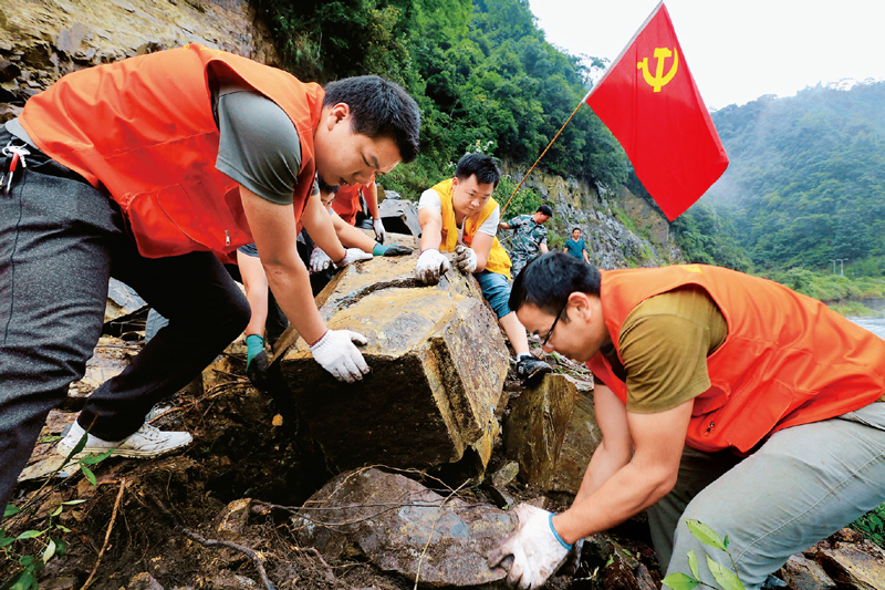 近日,貴州省黔東南苗族侗族自治州榕江縣境內(nèi)持續(xù)暴雨天氣,暴雨引發(fā)山洪,造成公路塌方等自然災(zāi)害。圖為2020年6月13日清晨,當(dāng)?shù)伛v村黨員干部、網(wǎng)格員組成的黨員先鋒搶險(xiǎn)突擊隊(duì),在榕江縣兩汪鄉(xiāng)兩汪村至上紐自然寨路段清除坍塌的石方。 人民圖片李長華/攝