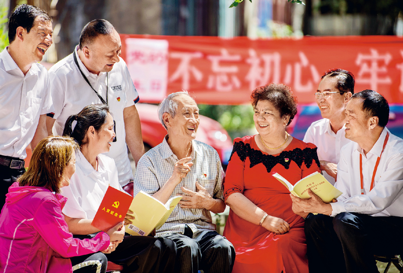 每年“七一”都是每個(gè)共產(chǎn)黨員最驕傲自豪的時(shí)刻,也是銘記初心和使命、重整行裝再出發(fā)的時(shí)刻。圖為2018年7月1日,烏魯木齊市天山區(qū)二道橋片區(qū)福壽巷社區(qū)的“民族團(tuán)結(jié)模范庭院”里,各族黨員圍坐在一起慶祝黨的生日。人民圖片金煒/攝