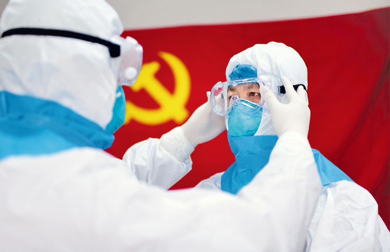 在抗擊新冠肺炎疫情的戰(zhàn)線上,廣大黨員干部不忘初心、牢記使命,挺身而出、沖鋒在前,讓黨旗在疫情防控斗爭第一線高高飄揚(yáng)。圖為2020年2月6日,重慶市璧山區(qū)人民醫(yī)院感染疾病科疫情防控專家組副組長、黨員丁飛穿好隔離服,準(zhǔn)備前往隔離病房。 人民圖片胡悅建/攝