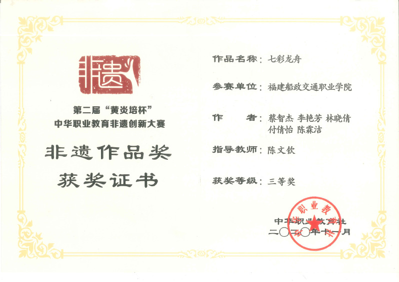(4)成功復(fù)原趕繒船1:10模型-“清代戰(zhàn)船”、福州傳統(tǒng)龍舟1:10模型-“七彩龍舟”船模,并榮獲第二屆黃炎培杯中華職業(yè)教育非遺創(chuàng)新大賽《清代戰(zhàn)船》、《七彩龍舟》一等獎、三等獎;