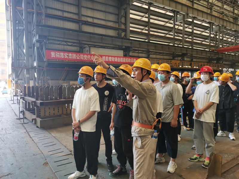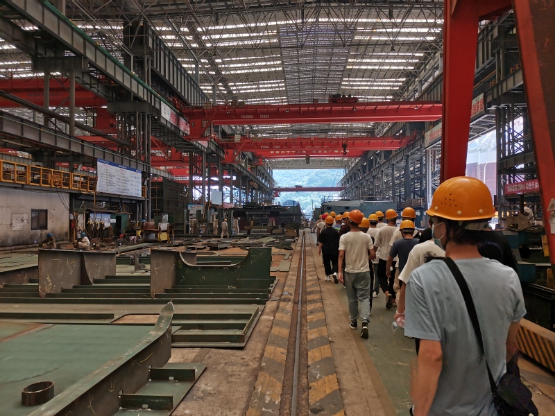 坐在車上從遠(yuǎn)處遙望就可以看見一座石像屹立在前方,那是馬尾造船廠創(chuàng)始人沈葆楨的石像。下了車,馬尾造船廠負(fù)責(zé)人熱情向我們走來,帶著講解員為在場(chǎng)學(xué)生們細(xì)細(xì)講述馬尾造船廠這155年來的建廠史,它濃縮了中國近代富國強(qiáng)兵的探索歷程。隨后,跟隨著講解員的步伐我們來到基地的設(shè)備制造廠,參觀最新的造船設(shè)備,感受精湛的造船工藝。最后,航海學(xué)院師生一行人來到碼頭,參觀造船工藝成果。