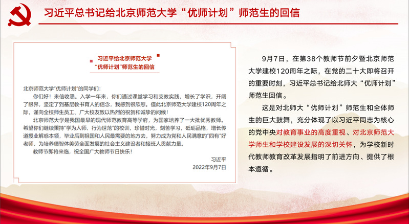 陳林泉老師:習(xí)近平總書記的回信,體現(xiàn)了以習(xí)近平同志為核心的黨中央對(duì)教育事業(yè)發(fā)展的高度重視,對(duì)北師大師生和學(xué)校建設(shè)發(fā)展的深切關(guān)懷。作為“四有”好老師的首倡地,北師大肩負(fù)著培養(yǎng)追夢(mèng)人和筑夢(mèng)人的雙重任務(wù),教育引導(dǎo)黨員同志廣大青年學(xué)子珍惜時(shí)光,刻苦學(xué)習(xí),砥礪品格,傳承校訓(xùn)精神,到祖國(guó)和人民最需要的地方去建功立業(yè)。