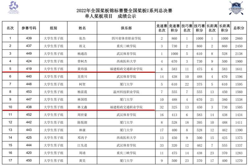 本次賽事分為精英組、公開(kāi)組、大學(xué)生組、青少年組。福建船政交通職業(yè)學(xué)院航海學(xué)院組織校槳板隊(duì)參加大學(xué)生組別賽事。黃煒強(qiáng)、林文鑫發(fā)揚(yáng)船政精神,努力拼搏,分別取得大學(xué)生組總積分第5名和第10名的好成績(jī)。