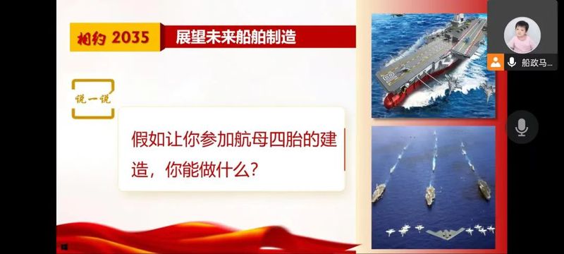 同時,黃其連老師結(jié)合航海學(xué)生專業(yè)實際,以航母三胎“福建艦”作為案例,讓同學(xué)們了解我國船舶制造業(yè)跨越式發(fā)展的成果。并發(fā)起討論“假如你有機會參與航母四胎的建造,你能做些什么”,通過話題討論,引導(dǎo)學(xué)生展望2035船舶制造,堅定學(xué)生“我要做什么、學(xué)什么、怎么做”的奮斗決心,把個人夢融入中國2035“海洋強國夢”,堅定強技報國的信念。