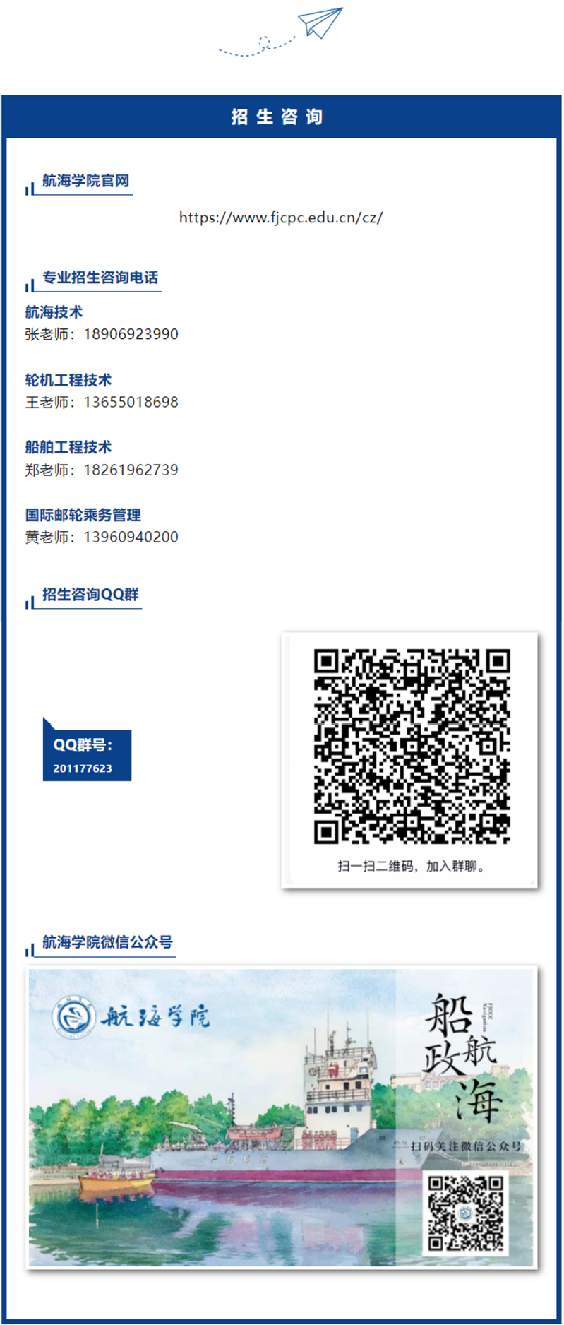 航海學(xué)院秉承與堅持船政學(xué)堂(1866年創(chuàng)辦)“前廠后堂”的辦學(xué)理念,經(jīng)過多年發(fā)展,目前開設(shè)航海技術(shù)、輪機(jī)工程技術(shù)、船舶工程技術(shù)、國際郵輪乘務(wù)管理四大專業(yè),其中航海技術(shù)、輪機(jī)工程技術(shù)、船舶工程技術(shù)三大國家級重點專業(yè)融合組建中國特色高水平專業(yè)群,榮膺我?!半p高計劃”重點打造的兩大專業(yè)群之一。
