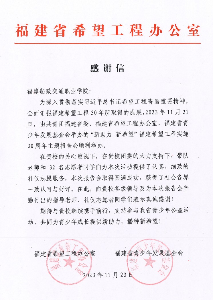 會后,福建省希望工程辦公室為我校發(fā)來感謝信,對參與此次禮儀志愿服務(wù)的師生表示感謝并期待再次合作!