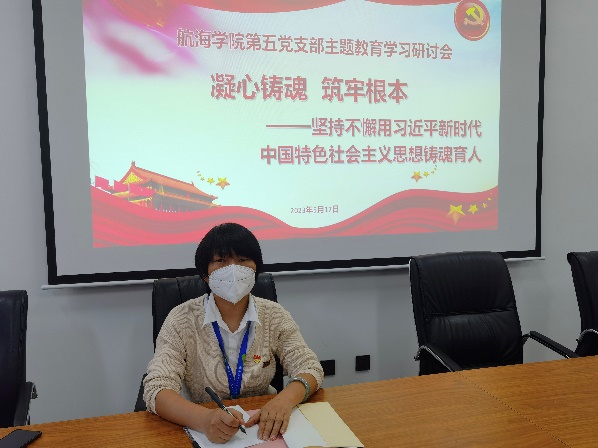 航海學(xué)院第五黨支部于2023年5月17日在校友樓307召開(kāi)主題教育學(xué)習(xí),研討專(zhuān)題-凝心鑄魂 筑牢根本——堅(jiān)持不懈用習(xí)近平新時(shí)代中國(guó)特色社會(huì)主義思想鑄魂育人,專(zhuān)題主要發(fā)言人為翁國(guó)玲副院長(zhǎng)。