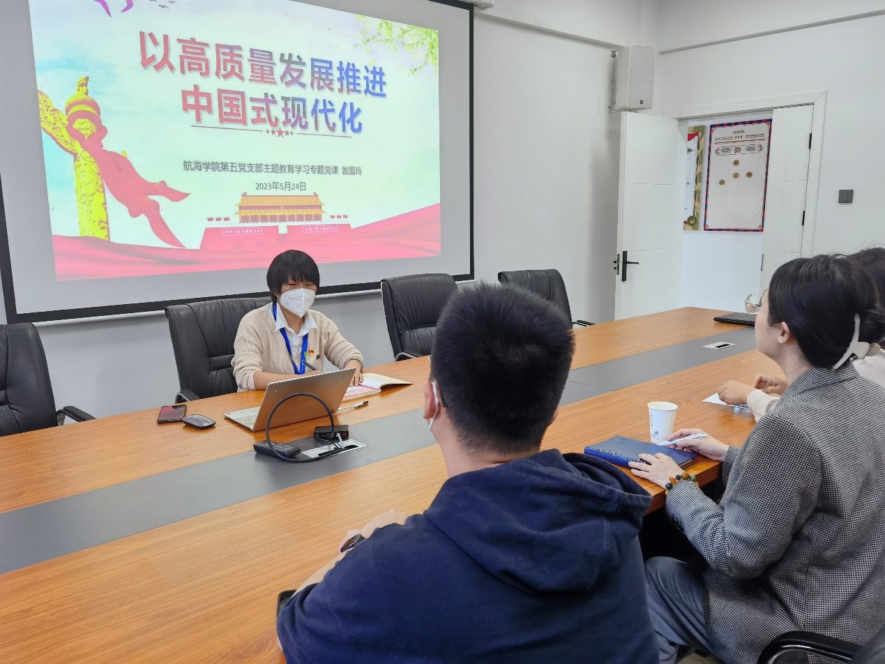 為推進(jìn)黨的二十大精神學(xué)習(xí)的宣傳貫徹深入開展,5月24日,航海學(xué)院第五黨支部書記翁國(guó)玲于29號(hào)樓307會(huì)議室開展了“以高質(zhì)量發(fā)展推進(jìn)中國(guó)式現(xiàn)代化”為題的黨課,黨支部全體黨員參加。