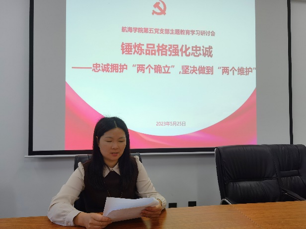 航海學(xué)院第五黨支部于2023年5月25日在校友樓307召開主題教育學(xué)習(xí),研討專題-錘煉品格強(qiáng)化忠誠—— 忠誠擁護(hù)“兩個確立”,堅決做到“兩個維護(hù)”,專題主要發(fā)言人為張秋霞老師。