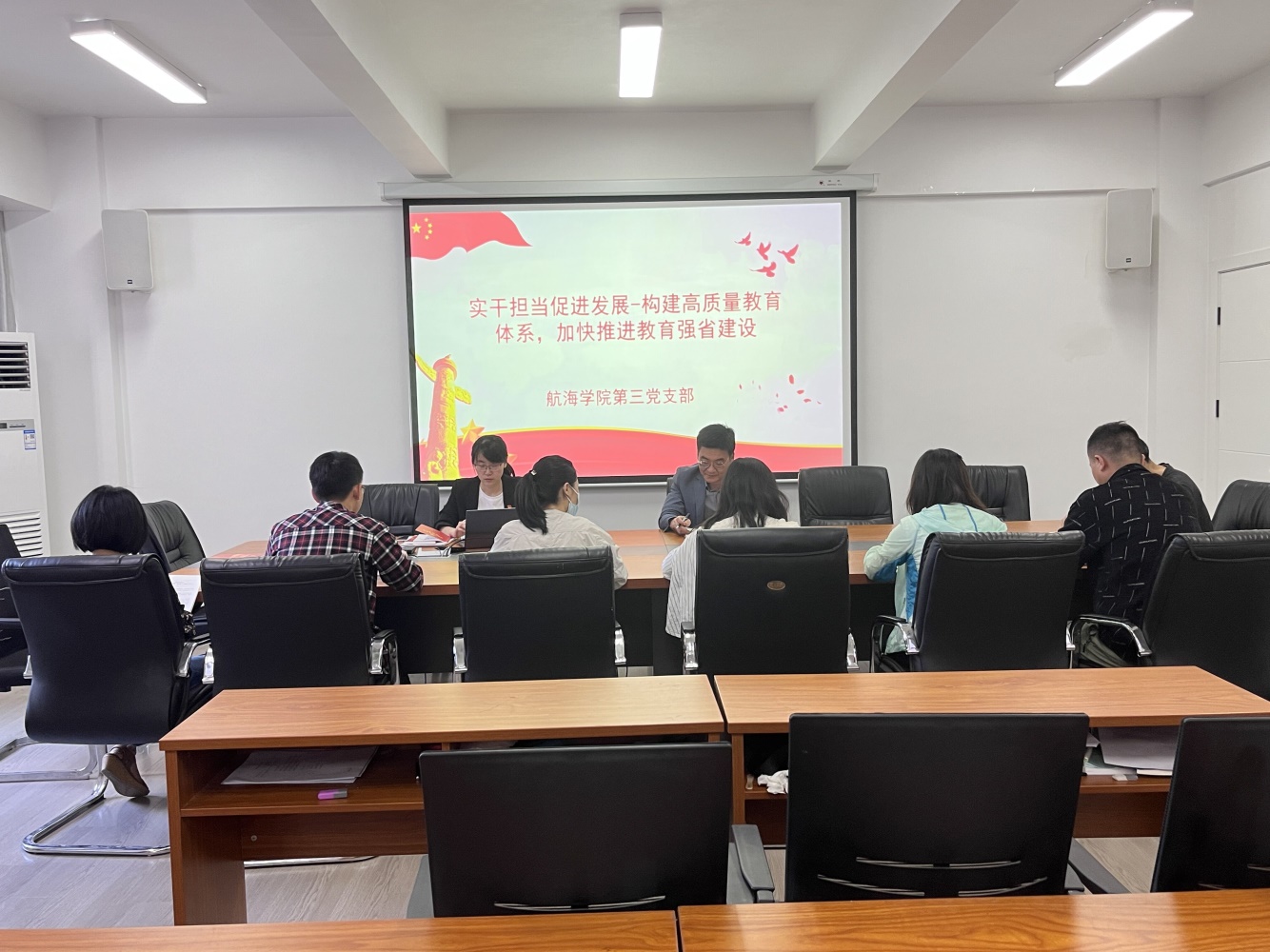航海學(xué)院第三黨支部于2023年6月1日在校友樓307召開主題教育學(xué)習(xí),研討專題-實(shí)干擔(dān)當(dāng)促進(jìn)發(fā)展-構(gòu)建高質(zhì)量教育體系,加快推進(jìn)教育強(qiáng)省建設(shè),專題主要發(fā)言人為宋偉偉。主要發(fā)言學(xué)習(xí)內(nèi)容實(shí)施科教興國(guó)戰(zhàn)略,強(qiáng)化現(xiàn)代化建設(shè)人才支撐。黨的二十大統(tǒng)籌世界百年未有之大變局和中華民族偉大復(fù)興全局,在全面實(shí)現(xiàn)小康、邁向社會(huì)主義現(xiàn)代化國(guó)家新征程的關(guān)鍵時(shí)期,強(qiáng)調(diào)科教興國(guó)戰(zhàn)略、人才強(qiáng)國(guó)戰(zhàn)略、創(chuàng)新驅(qū)動(dòng)發(fā)展戰(zhàn)略,彰顯了我們黨以更大力度不斷塑造發(fā)展新動(dòng)能新優(yōu)勢(shì),全面建設(shè)社會(huì)主義現(xiàn)代化國(guó)家、全面推進(jìn)中華民族偉大復(fù)興的決心和氣魄。