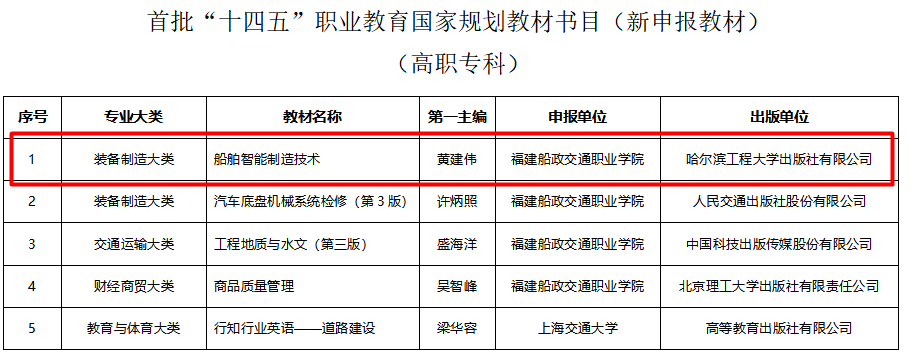 6月30日,教育部公布了首批“十四五”職業(yè)教育國(guó)家規(guī)劃教材書(shū)目,根據(jù)《“十四五”職業(yè)教育規(guī)劃教材建設(shè)實(shí)施方案》和《教育部辦公廳關(guān)于組織開(kāi)展“十四五”首批職業(yè)教育國(guó)家規(guī)劃教材遴選工作的通知》要求,經(jīng)有關(guān)單位申報(bào)、形式審查、專(zhuān)家評(píng)審、專(zhuān)項(xiàng)審核、專(zhuān)家復(fù)核、面向社會(huì)公示等程序,共確定7251種教材入選首批“十四五”職業(yè)教育國(guó)家規(guī)劃教材(以下簡(jiǎn)稱(chēng)“十四五”國(guó)規(guī)教材),涵蓋全部19個(gè)專(zhuān)業(yè)大類(lèi)、1382個(gè)專(zhuān)業(yè)。航海技術(shù)專(zhuān)業(yè)群入選三本,其中新申報(bào)入選1本,“十三五”復(fù)核教材入選兩本。