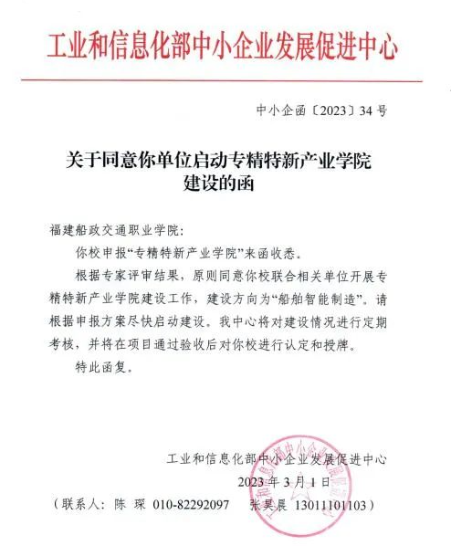 3月1日,工業(yè)和信息化部中小企業(yè)發(fā)展促進中心公布首批“專精特新產(chǎn)業(yè)學院”啟動建設名單,我校申報“船舶智能制造專精特新產(chǎn)業(yè)學院”經(jīng)過歷時半年的初審、線上考察、專家初評、專家會評等4輪競爭性遴選,最終從800多所高校中脫穎而出成功獲批立項建設。此次“專精特新產(chǎn)業(yè)學院”獲批建設,標志著我校在產(chǎn)教融合校企合作提質(zhì)升級上又邁出了堅實的步伐。