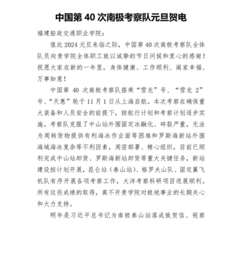 近日,遠(yuǎn)在南極執(zhí)行考察任務(wù)的中國第40次南極科學(xué)考察隊全體隊員向我院全體職工致以誠摯的節(jié)日問候,向我院對極地事業(yè)的長期支持和大力關(guān)心表示衷心的感謝。