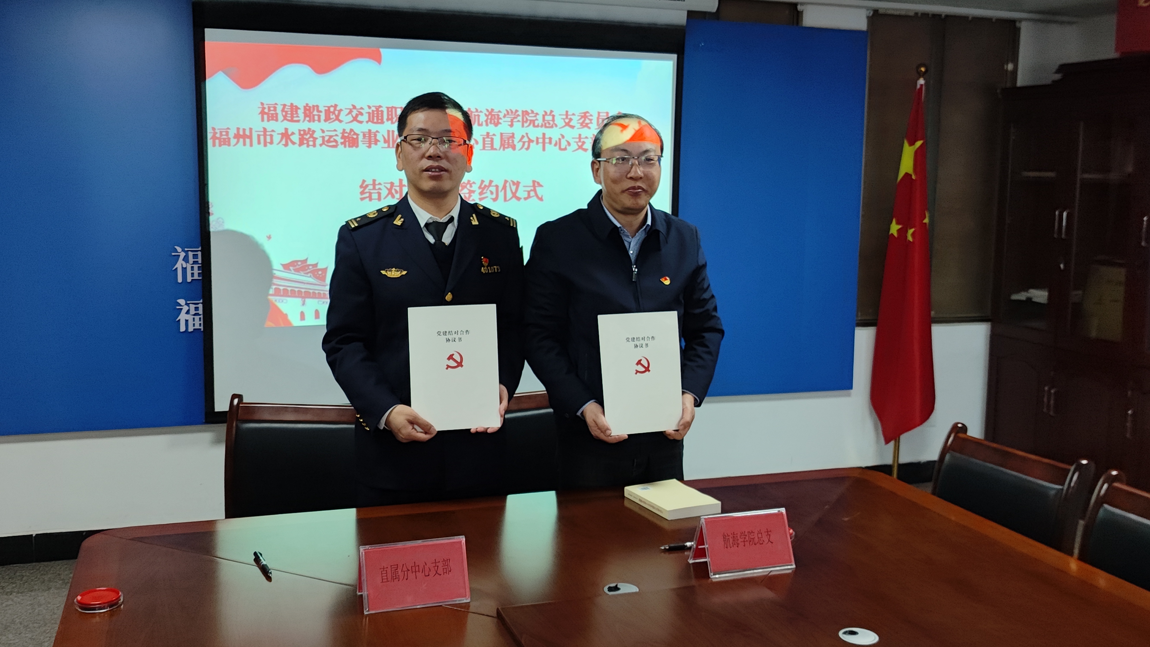 圖說:福州市地方海事局直屬海事處處長林凱、航海學(xué)院總支委員會江文書記,分別代表各自單位在黨建結(jié)對共建協(xié)議上簽約。