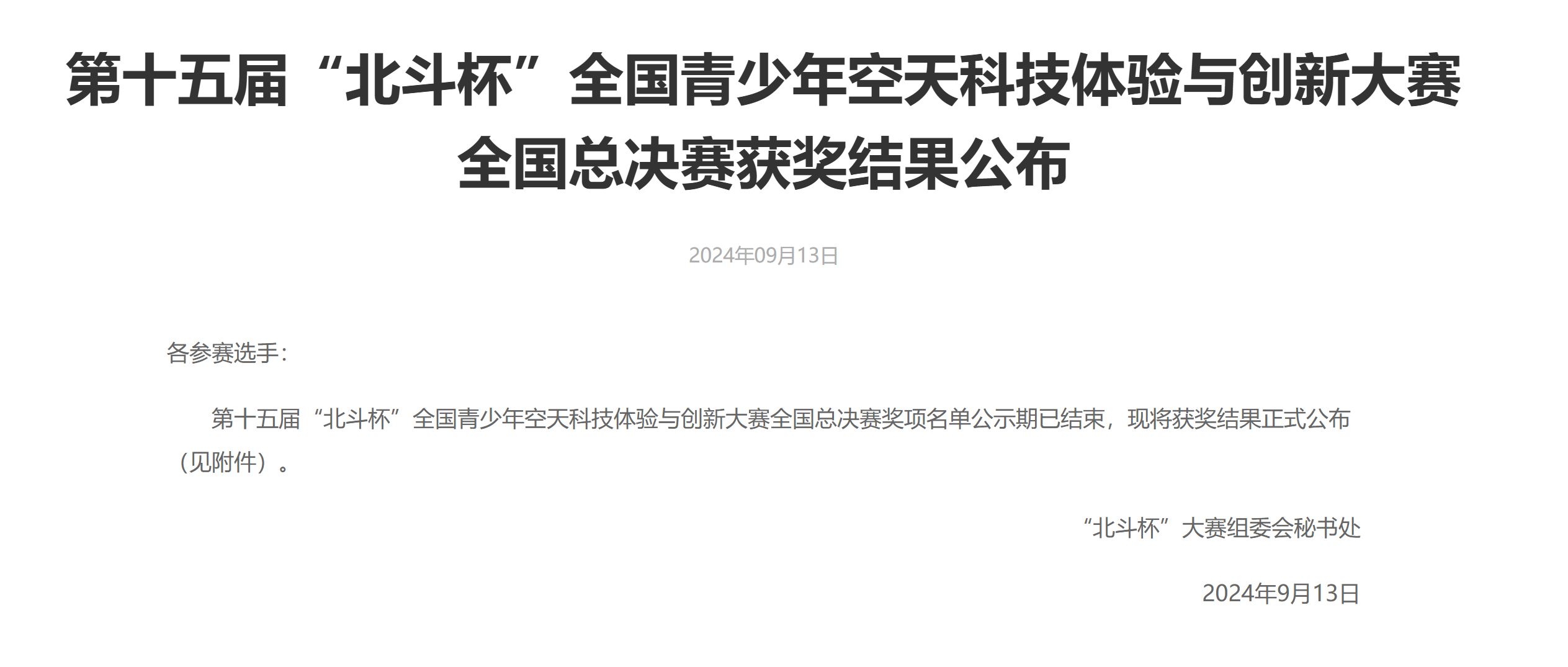 2024 年 9 月 13日,喜訊傳來(lái),我院學(xué)子在第十五屆“北斗杯”全國(guó)青少年空天科技體驗(yàn)與創(chuàng)新大賽中表現(xiàn)出色,榮獲Y2“北斗智慧時(shí)空”創(chuàng)意實(shí)物賽道全國(guó)二等獎(jiǎng)。