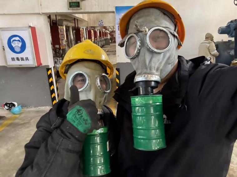 圖3:拆卸冷風(fēng)機(jī)                 圖4:氨機(jī)房作業(yè)戴防毒面具