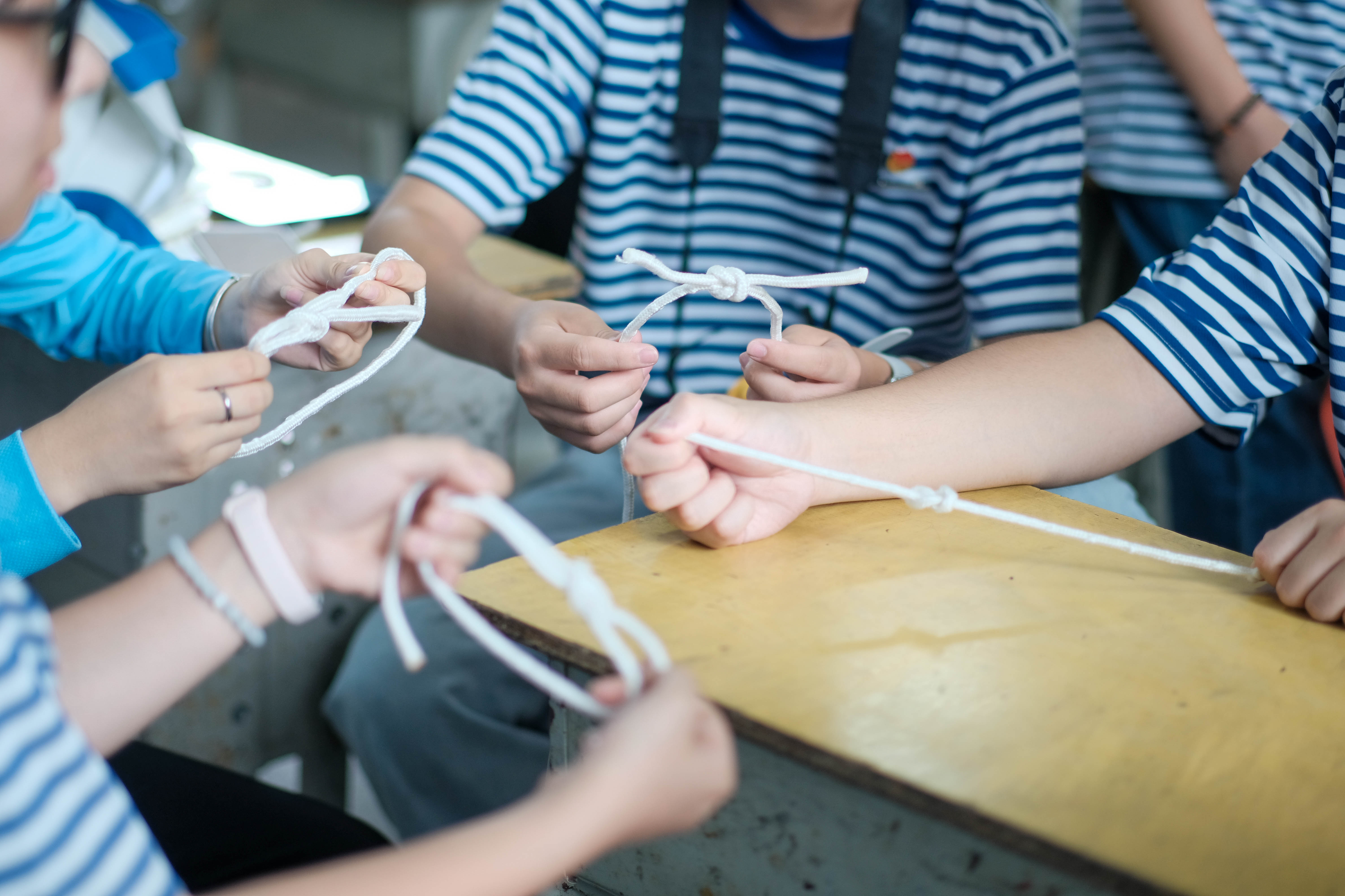 從最基礎(chǔ)的單結(jié)到航海必備的 “雙套結(jié)”,隊(duì)員們耐心講解每種繩結(jié)的用途:“漁民伯伯靠它固定漁網(wǎng),水手叔叔用它捆綁貨物,遇到危險(xiǎn)時(shí),它還能變成救生索呢!” 三年級(jí)的小宇舉著自己完成的 “八字結(jié)” 雀躍不已:“這個(gè)結(jié)像小蝴蝶,以后露營(yíng)我要用來(lái)綁帳篷!” 三十雙小手翻飛,彩繩在課桌上編織出一個(gè)個(gè)迷你航海夢(mèng)。
