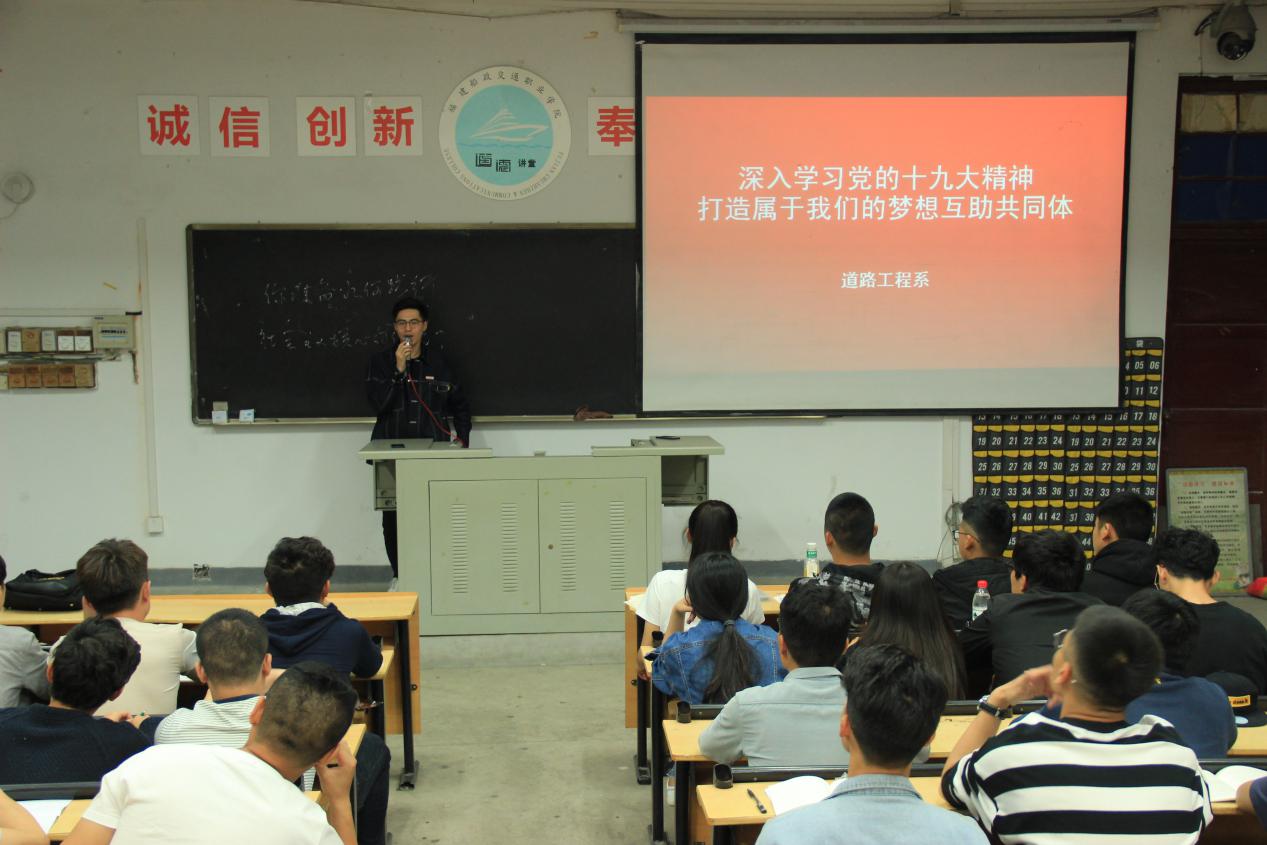 2018年4月25日我系在八號(hào)樓第二階梯教室開展了有關(guān)黨的十九大精神的主題講座。本次講座由道路工程系的輔導(dǎo)員范長宏老師進(jìn)行主持,道路工程系的全體入黨積極分子參與。