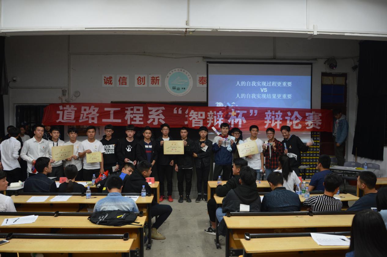 為豐富大學(xué)生的課余活動(dòng),培養(yǎng)同學(xué)們的思辯能力和語(yǔ)言表達(dá)能力,2018年4月10日晚上7點(diǎn),我系于土建樓第二階梯教室舉行了正方觀點(diǎn)為“人的自我實(shí)現(xiàn)過(guò)程更重要”,反方觀點(diǎn)為“人的自我實(shí)現(xiàn)結(jié)果更重要”的大學(xué)生辯論賽決賽。