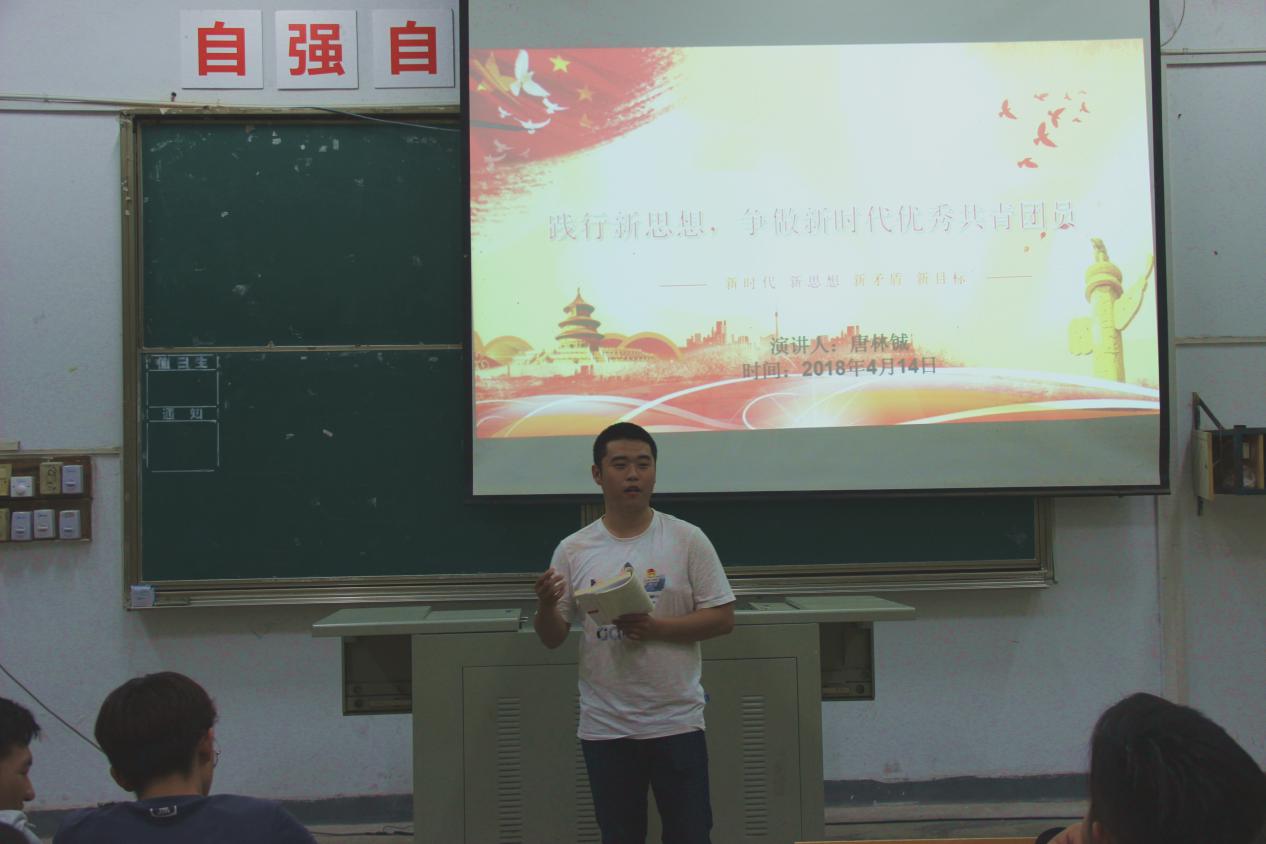 為了讓同學(xué)們更好地踐行十九大新思想,爭做新時代優(yōu)秀共青團(tuán)員,道路工程系唐林鋮同學(xué)于2018年4月14日在土建樓第一階梯教室為道路工程系16、17級同學(xué)開展了一場關(guān)于新思想的演講。