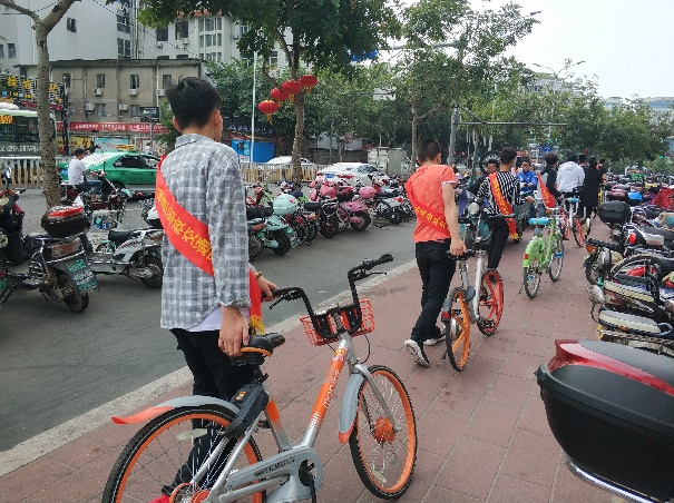 早上7點30分志愿者后志愿者們來到福建省福州市倉山區(qū)首山路,將路邊隨意??俊㈦s亂擺放的共享單車擺放整齊,同時倡導(dǎo)居民做文明的騎行者、文明的停放者、文明的宣傳者,自覺維護(hù)、愛護(hù)共享單車。本次活動主要分為兩個部分:一是整理維護(hù)共享單車,深入到倉山區(qū)各個街道,將隨意停放在城市主干道的共享單車統(tǒng)一搬到自行車指定停放點,同時把已遭損壞的共享單車單獨擺放并整理維護(hù);二是宣傳文明騎車?yán)砟?,針對不少市民和游客存在的在機(jī)動車道行駛自行車、橫穿馬路、不遵守交通規(guī)則等行為,加強(qiáng)宣傳引導(dǎo),為使用自行車的市民和游客發(fā)放文明用車小貼士,引導(dǎo)市民自覺維護(hù)良好形象。