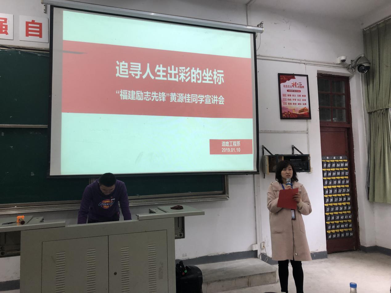 為了引導學生樹立崇高堅定的理想信念,養(yǎng)成執(zhí)著勤奮的學習態(tài)度,塑造奮發(fā)有為的精神氣質,2019年1月10日下午,道路工程系舉行了“尋求人生出彩坐標”勵志先鋒黃源佳事跡宣講會。道路工程系黨總支書記江文老師、道路工程系全體輔導員和各班學生代表出席了宣講會。